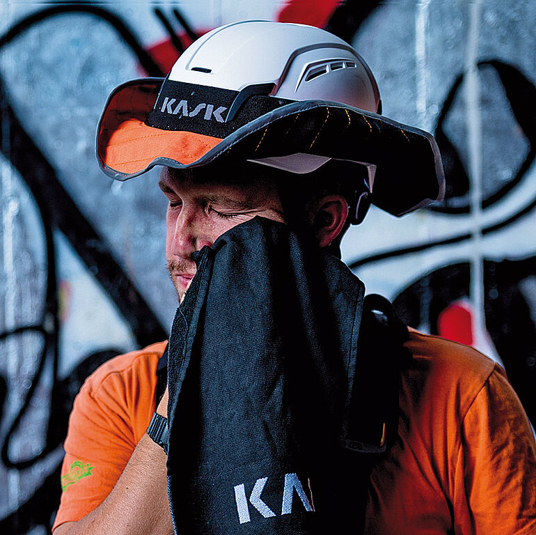 Die Helme von Kask sollen schon durch ihre Konstruktion dazu beitragen, die Belastung durch Hitze zu reduzieren. So gewährleisten beispielsweise interne Belüftungskanäle eine Verbesserung der Atmungsaktivität, während eine spezielle Innenpolsterung für hohen Tragekomfort sorgt. Zubehör wie der Kask-Sonnenschutz und der Nackenschutz bieten zusätzlichen Schutz vor den schädlichen Sonnenstrahlen und kommen mit einem UV-Schutzfaktor (UPF) von 50+ daher.