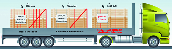 Die Oberfläche »KCN-09« ist ein Produkt, das sich durch seine Antirutscheigenschaften auszeichnet und sich speziell für offene Pritschen eignet. Der Gleitreibbeiwert liegt bei µ= 0,8. Die Oberfläche »KCN-13« weist den »Gummiboden-Effekt« auf. Dieser Antirutschboden ist besonders für Kastenwägen geeignet, mit denen Stückgut transportiert wird. Der Gleitreibbeiwert liegt bei µ = 0,8. Alle KCN-Antirutschböden werden in handelsüblichen Plattengrößen gefertigt. Als Trägermaterial kommen neben Holz auch Metall oder Kunststoff zum Einsatz. Bei den Oberflächen »KCN-01« und »KCN-13« ist alternativ auch eine Aufbringung direkt im Fahrzeug möglich.