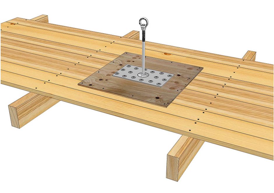 »Lux-top ASP für diverse Holzuntergründe«: Dieses Einsatzgebiet betrifft die Anschlagpunkte zum Aufschrauben auf Holzbalken (ASP EV 7) und/oder auf die Dachschalung (ASP EV 7 II). Hervorzuheben ist die festgelegte Mindestbreite für die Schaltungsbretter, die Anwendungsspannweite der realistischen Maße reicht von 70 mm bis 240 mm. Für die Befestigung der Schalung werden handelsübliche Nägel/Drahtstifte eingesetzt. Auf eine zusätzliche Verschraubung der Schalung kann also verzichtet werden. Es ist auch keine Nut-und Feder-Verbindung bei OSB erforderlich. Darüber hinaus schließt der große Anwendungsbereich z. B. Brettstapel- und Massivholzdecken mit ein.