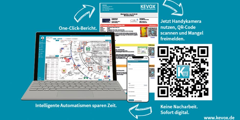 Mithilfe einer Smartphone-Kamera scannt der Auftragnehmer einen dieser QR-Codes ab. Das leitet ihn auf die passende Internetseite, um die Freimeldung digital durchzuführen. Der Auftragnehmer erfasst ein Foto und schreibt einen Kommentar dazu. Diese Dokumentation wird nach dem Absenden in die »Kevox Management Software« an den Auftraggeber übertragen.