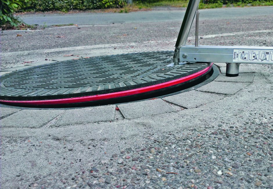 Damit sowohl das Öffnen als auch das Schließen eines Schachts rückenschonend gestaltet sind, bietet KHK zu den Produkten passende Hebe- und Bedienungsschlüssel an. So lassen sich Standardabdeckungen beispielsweise mithilfe des Fußhebelwerkzeugs »FL7A« von nur einer Person bewegen: Der Schlüssel wird dazu einfach in die Aushebeöffnung gesteckt und um 90° im Uhrzeigersinn gedreht, sodass er sich fest in die Abdeckung einhakt. Mit Betätigen des Fußhebels klappt dann der Schachtdeckel ohne großen Arbeitsaufwand nach oben und kann mittels des Werkzeugs in leicht angewinkeltem Stand in die entsprechende Richtung gezogen werden. In umgekehrter Reihenfolge lässt sich der Schacht im Anschluss wieder schließen. Größere Flächen- und Reihenabdeckungen sollten zwar weiterhin zu zweit bedient werden – Hebeschlüssel und Adapter sorgen auch hier für einen sicheren Zugang.