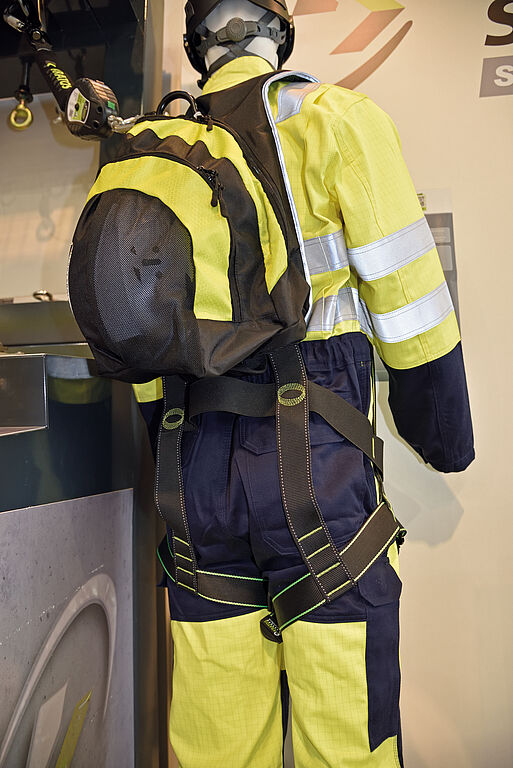 Das Rückenpolster aus atmungsaktivem Material sorgt für einen hohen Tragekomfort, während die reflektierende Umrandung auch bei schlechten Licht- oder Wetterverhältnissen hohe Sichtbarkeit gewährleistet. Der Auffanggurt nach EN 361 verfügt zudem über einen D-Ring im Brustbereich und einen am Rücken, Sturzindikatoren an den vorderen Beinschlaufen und den Rückengurten sowie ein Verstausystem für Verbindungsmittel, wenn diese nicht gebraucht werden.