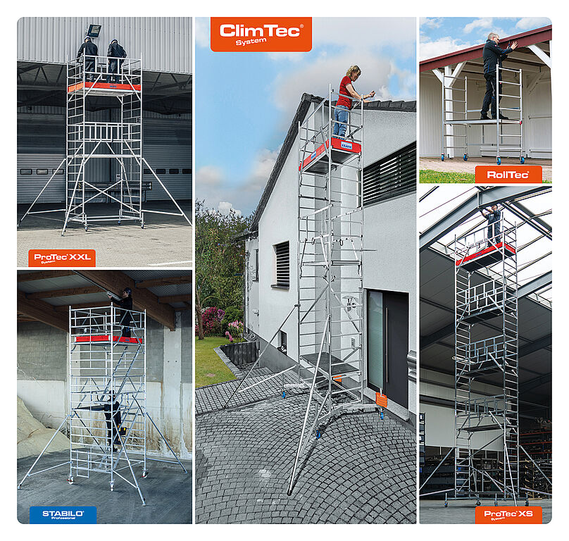 Krause-Fahrgerüste sind wie Leitern und Tritte in den Produktlinien »Stabilo«, »Monto« und »Corda« erhältlich. Vom gelegentlichen Einsatz im privaten Bereich (»Corda«) über Heim- und Handwerker (»Monto«) bis hin zum täglichen professionellen Einsatz in Handwerk und Industrie (»Stabilo«) können Arbeitshöhen von 3,00 bis zu 14,50 Meter erreicht werden. Damit ist auch in großer Höhe ein komfortabler Arbeitsplatz gegeben, bei dem der Benutzer beide Hände frei hat und zusätzlich Werkzeug oder Material ablegen kann. Während im »Corda«-Programm Leiter-, Klein- und Arbeitsgerüste in Arbeitshöhen von 2,90 bis 5,00 m angeboten werden, finden sich im Bereich »Monto« Fahrgerüste der Serien »ClimTec« und »ProTec« bis zu Arbeitshöhen von 12,30 m. »Stabilo« Fahrgerüste sind in acht verschiedenen Varianten erhältlich und unterstützen Profis bei Arbeiten bis zu Arbeitshöhen von 14,50 m.