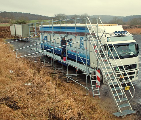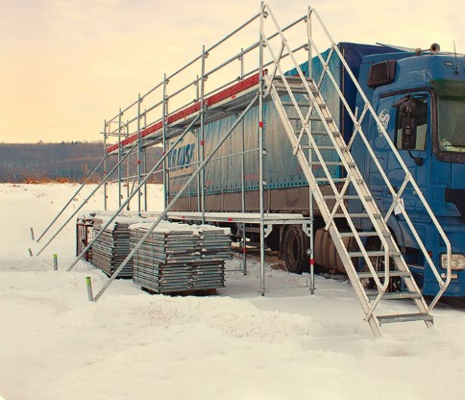 Das »Eisfrei«-Gerüstsystem ist so konzipiert, dass es auf Autohöfen, in Werkstätten oder in Betriebshöfen verwendet werden kann, um große Fahrzeuge das gesamte Jahr über einfach erreichen zu können – inklusive der Dachflächen. Der dreiteilige Seitenschutz und die Stahlloch-Beläge der TÜV-geprüften Steiglösung sollen laut Hersteller bei jedem Wetter sicheres und komfortables Arbeiten bieten. Aufgrund von Systembauteilen und verschiedenen Plattformgrößen ist das Gerüst zudem größenvariabel und damit für jeden Lkw und jedes Nutzfahrzeug flexibel einsetzbar. Einen sicheren Zugang soll hierbei der rutschsichere Treppenaufgang aus Stahl-Gitterroststufen ermöglichen. Der Nutzer gelangt dadurch sicher auf die Arbeitsplattform, um die Dachfläche zu reinigen.