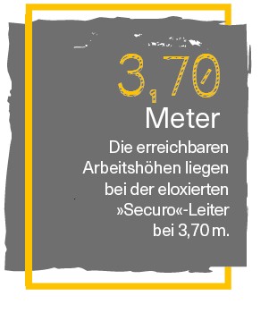 Die erreichbaren Arbeitshöhen liegen für die »Secury« mit »MultiGrip« bei maximal 3,25 m, mit der eloxierten »Securo« erreicht der Anwender sogar 3,70 m. Vor dem Kauf einer Stufen-Stehleiter sollte daher die zu erreichende Arbeitshöhe in die Entscheidung miteinbezogen werden.
