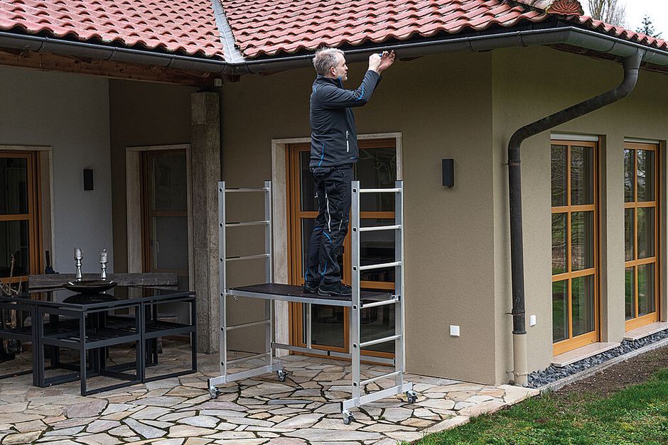 Das Klappgerüst erreicht eine Arbeitshöhe von 2,80 m. Nach dem ersten Aufbau besteht es nur noch aus zwei Teilen, was neben dem Transport auch den Auf- und Abbau erleichtert. Etwas höher geht es mit dem Kleingerüst, das neben einer Arbeitshöhe von 3,00 m und einseitigen Rollen auch über eine größere Arbeitsfläche verfügt. Außerdem kann es in Treppenstellung genutzt werden.