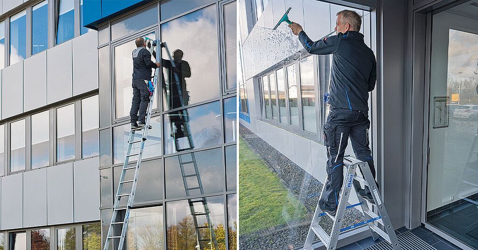 Um Anwendern den größtmöglichen Nutzen bei maximaler Arbeitssicherheit zu bieten, hat das Krause-Team die Stehleitern der »Stabilo«-Serie sowie Glasreiniger- und Podestleitern um Ausführungen mit R13-Stufen erweitert. Die Stufen mit offenem Lochbild bieten auch unter widrigen Bedingungen ein hohes Maß an Sicherheit und sind leicht zu reinigen. Die Profilierung der Stufen verhindert zudem das Festsetzen von Schmutz, Schlamm, Schnee oder Eis, da die Verunreinigungen durch die Löcher fallen. Beim Besteigen der Leitern ist somit eine Selbstreinigungsfunktion gegeben. Neben den Stufen ist auch die Plattform der einseitigen Stehleiter mit diesen rutschhemmenden Eigenschaften ausgestattet. Zusätzlich punktet die Leiter durch geringen Verschleiß, da die Stufen komplett aus Aluminium gefertigt werden und nicht mit zusätzlichen Gummi- oder Kunststoffeinlagen ausgestattet werden.