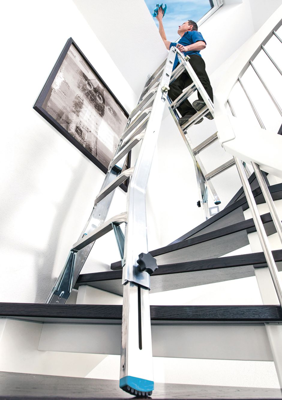 Stufenlos verstellbar gleichen sie schnell und unkompliziert Unebenheiten wie Treppenstufen, Absätze oder Höhenunterschiede im Gelände aus. Das System ermöglicht den Einsatz der Gelenkleiter auch in verwinkelten Bereichen wie Treppenhäusern oder auf unebenen Böden.