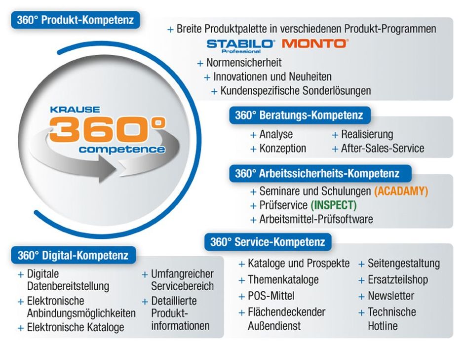 Krause steht für durchdachte Steigtechnik, die Innovation, Sicherheit und Anwenderfreundlichkeit vereint. Im Mittelpunkt stehen langlebige Produkte, die durch hochwertige Materialien und präzise Verarbeitung überzeugen. Die stetige Weiterentwicklung basiert auf dem engen Austausch mit Anwendern und Partnern aus der Praxis. So entstehen Lösungen, die sich an realen Anforderungen orientieren und kontinuierlich verbessert werden. Das Produktportfolio umfasst ein breites Spektrum an Steigtechnik, darunter Leitern, Tritte, Fahrgerüste (fahrbare Arbeitsbühnen) und ortsfeste Steigleitern. Darüber hinaus bietet Krause auch kundenindividuelle Sonderlösungen, die genau auf den jeweiligen Einsatzzweck abgestimmt sind.