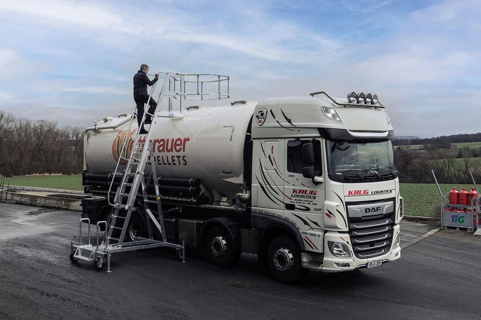 Das Fahrgestell der Krause-Tankwagenleiter besteht aus stabilem, feuerverzinktem Stahl und ist mit Handgriffen für leichtes Verfahren ausgestattet. Dies ermöglicht eine hohe Flexibilität im Einsatz, da die Leiter schnell am gewünschten Einsatzort platziert werden kann. Die weit auskragende Plattform ermöglicht zudem Arbeiten, ohne dass Silo- oder Kesselwagen unterfahren werden müssen. Die Leiter kann mit geringem Kraftaufwand über eine wartungsfreundliche Zahnstange mit Kurbel im Raster von 280 mm von Sprosse zu Sprosse höhenverstellt werden. So kann sie optimal an unterschiedliche Fahrzeughöhen angepasst werden. Eine zusätzliche Arretierung der Zahnstange verhindert ein unbeabsichtigtes Verstellen und ein unkontrolliertes Zurückgleiten des Leiteroberteils.Nach dem Einstellen der Höhe und dem Feststellen der Lenkrollen kann die Leiter bestiegen und mit der Arbeit begonnen werden. Der beidseitige Handlauf sorgt für maximale Sicherheit beim Auf- und Abstieg und geht direkt in das Geländer der Plattform über.