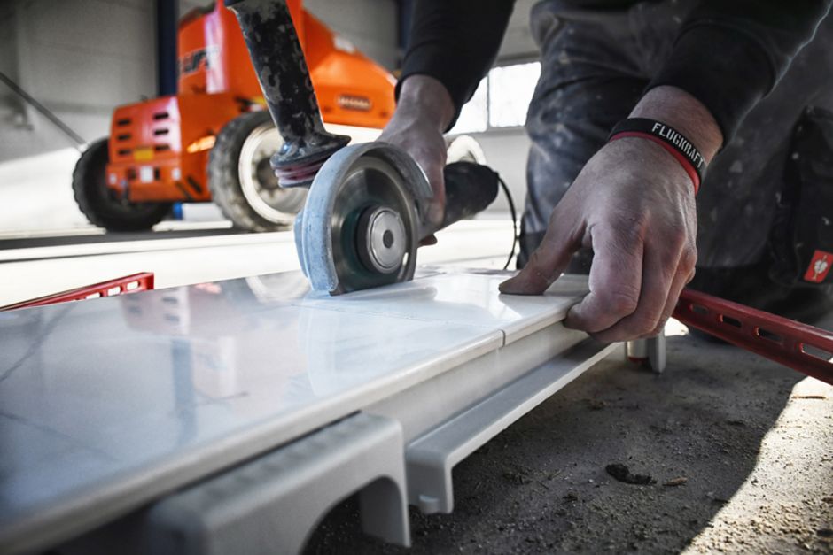 Die Abdeckungen werden über den Staubkanal des Grundkörpers in Nuten eingeklickt. Hinzu kommt eine weitere Version, die den Staubkanal komplett bündig abschließt. So ist jeweils ein sicherer Halt gegeben und ein Verrutschen ausgeschlossen. Die Gesamtkonstruktion ist auf schnelleres Fliesenschneiden, präzises Arbeiten sowie hohe Sicherheit bei der Anwendung ausgelegt. J