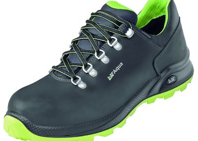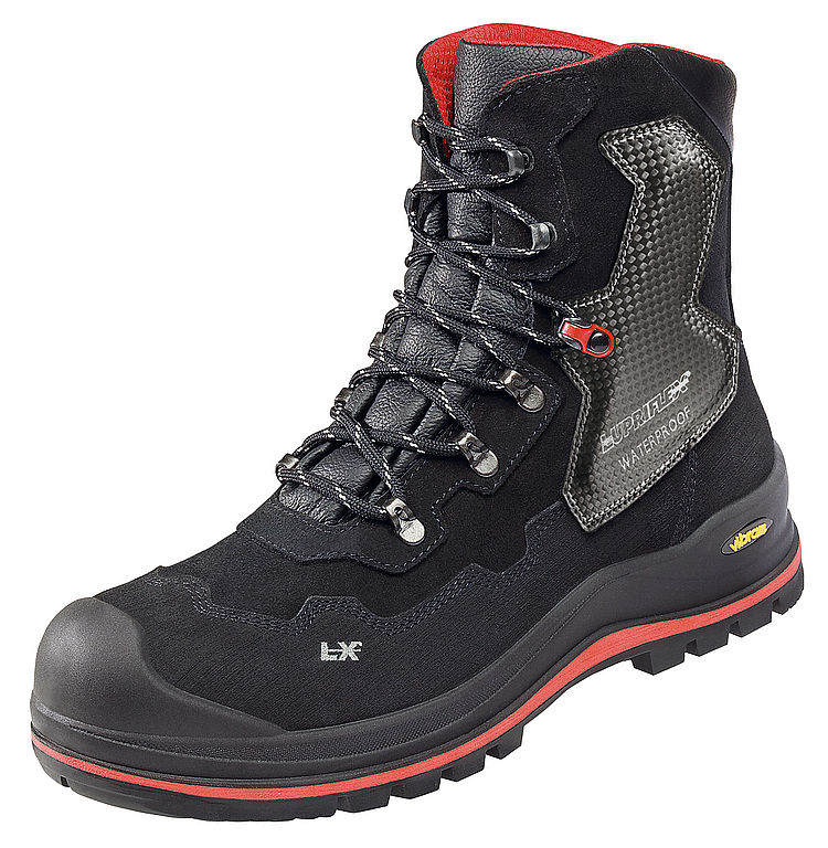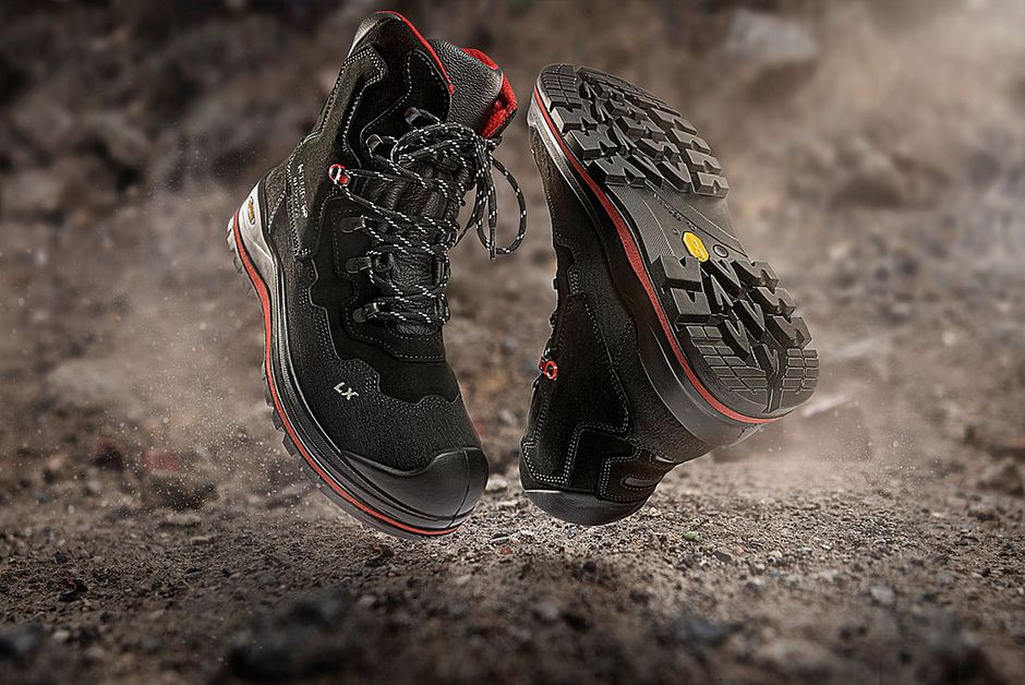 Das zweiteilige Schutzkonzept besteht aus einem Kunststoff- und einem Lederelement und stabilisiert das Sprunggelenk seitlich, sodass ein Wegknicken kaum möglich ist. Darüber hinaus ist der Stiefel mit einem Durchtrittschutz aus Stahl ausgestattet und aufgrund seiner Klimamembran wasserdicht. Gegen Abnutzung und Stöße wirkt ein Kantenschutz aus Polyurethan. Die abriebfeste Gummisohle von Vibram mit 5 mm starkem, griffigem Profil bietet den auf der Baustelle nötigen Grip.
