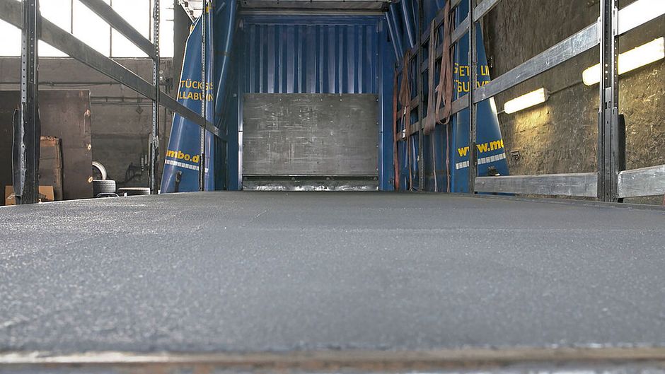 Mit »Triflex ProTruck« wird die Reibungskraft der Ladefläche erhöht und somit einem Verrutschen der Ladung vorgebeugt. Dabei wird mithilfe des PMMA-basierten Materials sowie der für den Anwendungszweck speziell eingestellten Einstreuung eine erhöhte Antirutsch-Beschichtung des Aufliegers hergestellt. »Auf konventionelle Rutschmatten kann damit verzichtet werden«, sagt Jan Zimmermann, Leiter Industrievertrieb bei Triflex. »Hierdurch lassen sich für die Ladungssicherung bis zu 30 Minuten pro Be- und Entladevorgang einsparen. Zudem wird das Risiko für Fehler minimiert.«