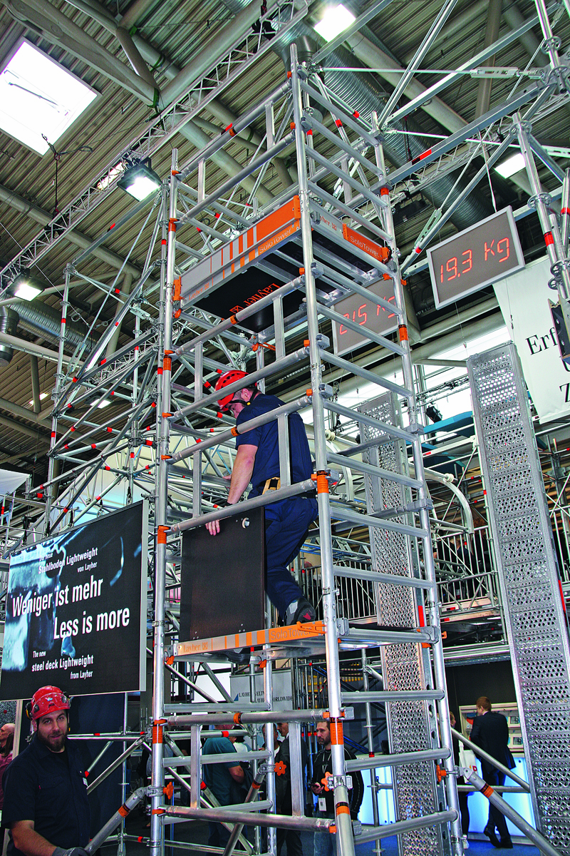Im Mittelpunkt stand der »SoloTower«, ein kompaktes Fahrgerüst aus leichten Einzelbauteilen. Das System zeichnet sich durch einfach zu handhabende Aluminiumbauteile aus, die in Kombination mit Montagehaken die schnelle Mitnahme von Ebene zu Ebene ermöglichen. Aufgrund der »3-T-Methode (Through The Trapdoor)« gelangt der Monteur durch die Durchstiegsbrücke auf die Plattform – und das aufgrund vormontierter Doppelgeländer bereits im gesicherten Bereich. Ein einzelner Monteur ist deshalb dazu in der Lage, den »SoloTower« Schritt für Schritt auf sichere Weise aufzubauen.