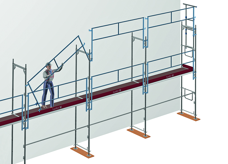 Für einen vorlaufenden Seitenschutz ohne zusätzliche Arbeitsschritte hat Layher das Allround Geländer System AGS entwickelt. Durch den AGS-Stiel und die bewährten »STAR«-Geländer lassen sich Fassadengerüste im Allround-Gerüst mit einem zweiteiligen, vorlaufenden Seitenschutz ohne die Verwendung von temporären Seitenschutzteilen errichten. Aufgrund der Geländereinhängungen können die »STAR«-Geländer von der gesicherten Lage aus montiert und mit dem AGS-Stiel nach oben geschwenkt werden. D