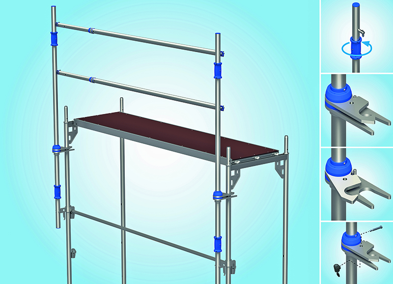 Beim neuen systemintegrierten I-Geländer für das »Blitz«-Gerüst handelt es sich um ein vorlaufendes Geländersystem aus Geländer- und Zwischenholm, welches von gesicherter Lage schnell montiert werden kann und im Gerüst verbleibt. Die leichte, einteilige Rahmenkonstruktion dient als vorlaufende Absturzsicherung beim Auf- und Abbau des Gerüsts, alternativ zum Montage-Sicherungs-Geländer (MSG). Anders als das temporäre MSG verbleibt das I-Geländer im Gerüst und ersetzt die Systemgeländer – ein zusätzlicher Montageaufwand entfällt.