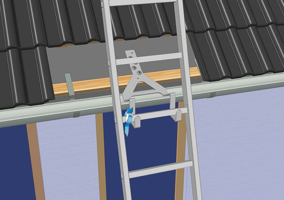 Während in der Baustellenpraxis die Leitern für das Steildach vielfach immer noch einfach an die Dachrinnen gelehnt oder geklemmt werden, gibt es noch eine weitere Möglichkeit der Fixierung – entweder auf der Konterlattung oder der Traufbohle.