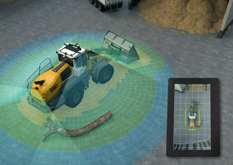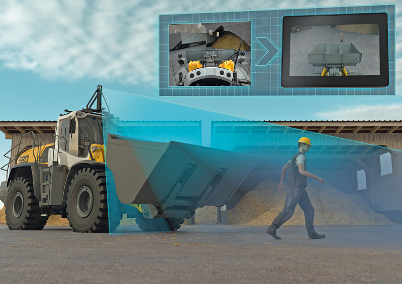 Die Arbeitsscheinwerfer werden aktiviert, um den Gefahrenbereich nahe der Maschine auszuleuchten. »Das spart Zeit und minimiert das Unfallrisiko, gerade bei Nachteinsätzen«, erklärt Mark Walcher. Denn gerade beim Ein- und Aussteigen aus den großen Maschinen ist die Unfallgefahr am größten. Außerdem hat Liebherr im Laufe des Jahres vier weitere komplett neu entwickelte Assistenzsysteme vorgestellt, die den Maschinenführer bei seiner täglichen Arbeit unterstützen sollen. Hierzu zählen eine eigens entwickelte aktive Personenerkennung heckseitig, eine neue Joystick-Lenkung, eine verbesserte Wiegeeinrichtung sowie ein integriertes Reifendrucküberwachungssystem. »Mit diesem Paket bieten wir unseren Kunden noch mehr Sicherheit bei größtmöglicher Effizienz«, so der Produktmanager. Die neue Lenklösung mittels Joystick gibt dem Fahrer genaue Rückschlüsse über die Position des Radladers, da die Joystick-Stellung exakt den Knickwinkel abbildet. Die Sensorik der neu entwickelten Rückraumüberwachung kann zwischen Personen