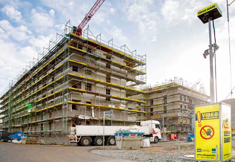 Denn gerade bei der modularen Bauweise mit Holz und Beton werden zahlreiche Krane eingesetzt, um die vorgefertigten Wand- und Deckenmodule zu montieren. Damit diese nicht beschädigt werden und weder Kraftstoff noch vergütungsfähige Metalle oder Maschinen entwendet werden, schützt »Video Guard« die Großbaustelle. Insgesamt fünf Türme sind auf dem Gelände platziert und überwachen die Zugangsbereiche, Container sowie abgestellte Baufahrzeuge. Durch das Zusammenspiel von drei Ultra-Lowlight-Kameras, mit unterschiedlichen Öffnungswinkeln, wird laut Maibach ein lückenloses Bild des Erfassungsbereichs erzeugt. Dadurch werden zuverlässig alle Vorkommnisse in einem Überwachungsradius von bis zu 5 300 m2 erfasst.