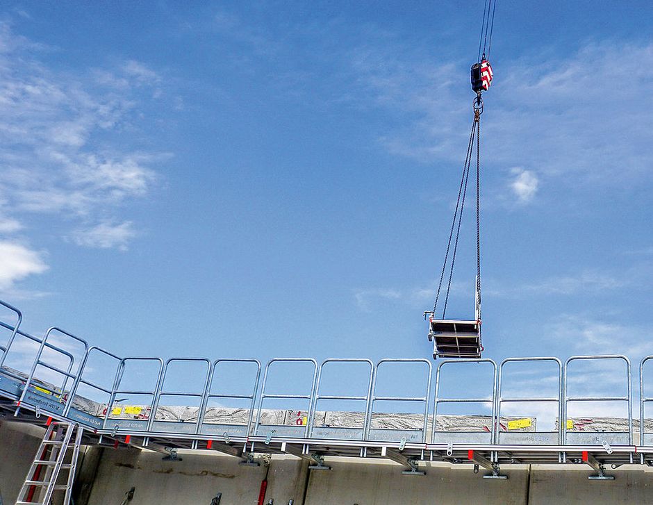 Ebenfalls kam die neue Betonierbühne ›SigeMax‹ auf der Baustelle zum Einsatz. Die Plattform wiegt lediglich 50 kg und punktet mit ihren hohen Sicherheitsstandards. Darüber hinaus habe sie mit ihren vielfältigen Einsatzmöglichkeiten überzeugen können. Durch die modifzierbaren Einhängeköpfe ist es nach Angaben des Herstellers zudem möglich, die »SigeMax« an jedem gängigen Rahmenschalungssystem zu installieren.