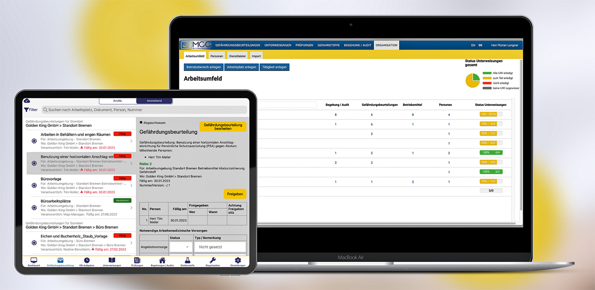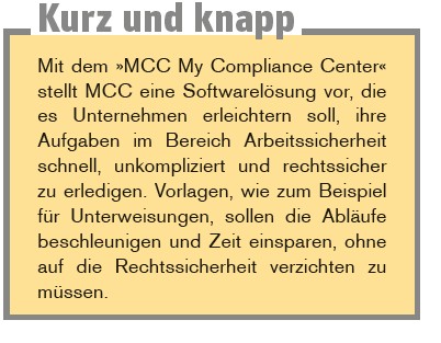 Das »MCC My Compliance Center« soll Unternehmen die einfache, schnelle, effiziente und rechtssichere Erledigung ihrer Aufgaben im Bereich Arbeitssicherheit ermöglichen. Der Organisations- und Prozessaufwand verringere sich erheblich. Zudem werde die Rechts- und Regelkonformität gewährleistet. Die intuitive Menüführung leitet die Anwender einfach und schnell durch alle Arbeitssicherheitsaufgaben.