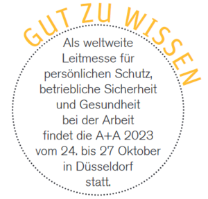 Gemeinsam mit dem von der Bundesarbeitsgemeinschaft für Sicherheit und Gesundheit bei der Arbeit (Basi) e.V. durchgeführten und parallel stattfindenden Internationalen Kongress für Arbeitsschutz und Arbeitsmedizin soll die Fachmesse alle Aspekte einer ganzheitlichen Präventionskultur abdecken – von betrieblichem Gesundheitsmanagement über den persönlichen Schutz bis hin zu Workplace Design und betrieblichem Sicherheitsmanagement. Grundsätzlich gilt die A+A aber auch als eine der größten Plattformen, um neue Workwear-Lösungen zu präsentieren.