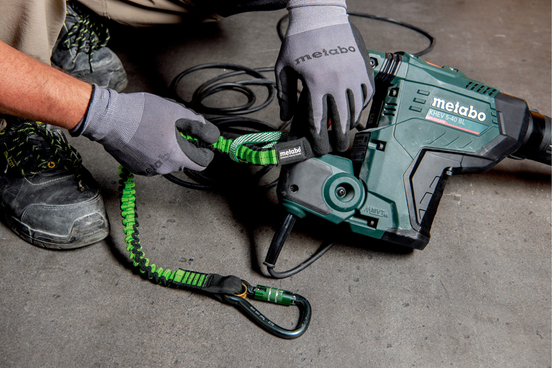 Mit den Werkzeug-Sicherhungsgurten folgt Metabo einem klaren Ziel: »Damit setzen wir unsere Sicherheitsoffensive konsequent fort«, sagt Produktmanagerin Haas. Denn die Lösungen von Metabo sollen für sicheres Arbeiten in jedem Bereich sorgen. Rund 80 Prozent der Elektrowerkzeuge wiegen bis zu fünf kg. Für diese Maschinen gibt es den neuen Werkzeug-Sicherungsgurt wahlweise mit Karabiner und Schlaufe oder als Variante »Quick Connect« mit Karabinern an beiden Enden.