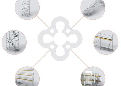 Das »MEKit« ist pro Turm mit vier Stielen für schwere Lasten über 1 000 kN (= 100 t) nutzbar und kann im Längen- und Breitenraster 1,50, 2,00 und 2,50 m konfiguriert werden. Doppel-U-Profil-Stiele in verschiedenen Längen werden mit Vierkant- und Rundprofilen verbunden und stabilisiert. Die Komponenten bestehen aus feuerverzinktem oder pulverbeschichtetem Stahl für lange Lebensdauer. Fußspindeln ermöglichen zentimetergenaue Höheneinstellung.