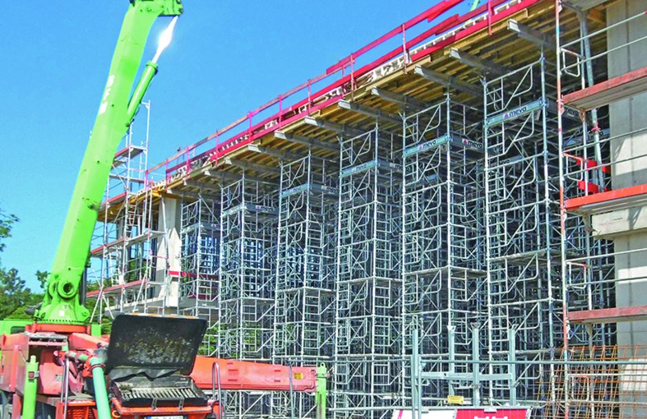 Die auskragende Decke wurde in einer Höhe von 9,31 m durch das Traggerüstsystem »MT 60« gehalten. Mit nur drei Rahmentypen für alle Deckenhöhen vereinfacht das Traggerüstsystem die Baustellenlogistik, reduziert Lagerhaltung und erleichtert den Transport. Die Türme wurden liegend aufgebaut. Das clevere System erforderte dabei kein Werkzeug, Bolzen oder Stecker. Zudem wiegen die einzelnen Teile nur maximal 15 kg und erleichterten so die Montage.