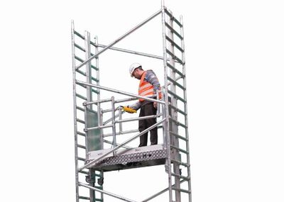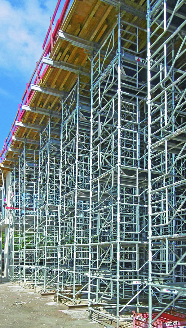 Um nach dem Aufbau das Krangehänge von den Anschlagpunkten zu lösen oder die Türme miteinander zu verbinden und auszusteifen, konnten die Arbeiter den integrierten Sicherheitsaufstieg des »MT 60« nutzen. Zusammen mit der Rundum-Absturzsicherung der Arbeitsplattformen, Durchstiegsluken und selbstsichernden Verbindungen erfüllt das Traggerüstsystem strengste Sicherheitsanforderungen. »Wir sind sehr zufrieden mit dem ›MT 60‹ von Meva«, sagt Bauleiter Marco Weingärtner von Riedel Bau. »Wenn unsere Mitarbeiter den Turm hinaufklettern, kann ich mich auf die integrierten Sicherheitsvorkehrungen verlassen.«