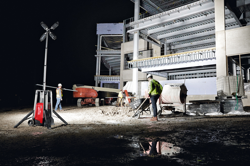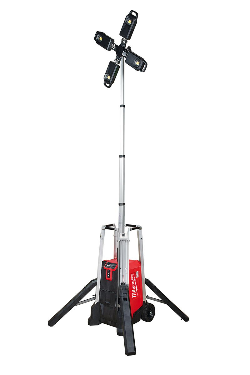 In der Summe bietet der Baustellenstrahler alle,s was ein Profi erwartet und benötigt: Produktivität, hohe Leistung und Sicherheit für den Anwender. Die Lichtleistung lässt sich je nach Bedarf in drei Stufen einstellen. Im Akkubetrieb sind bis zu 20 000 lm möglich. Der Strahler kann aber auch direkt ans Stromnetz angeschlossen werden. Dann beträgt die maximale Stärke 27 000 lm, während gleichzeitig auch ein »MX Fuel«-Akku im Gerät geladen werden kann. Die vier großen Lichtköpfe aus schlagfestem Kunststoff lassen sich einzeln drehen und ausrichten – so ist jederzeit eine optimale Ausleuchtung des Arbeitsbereiches gewährleistet.