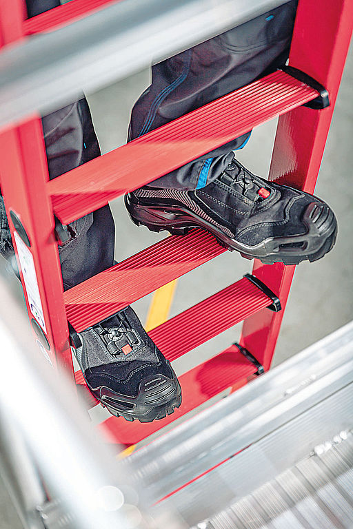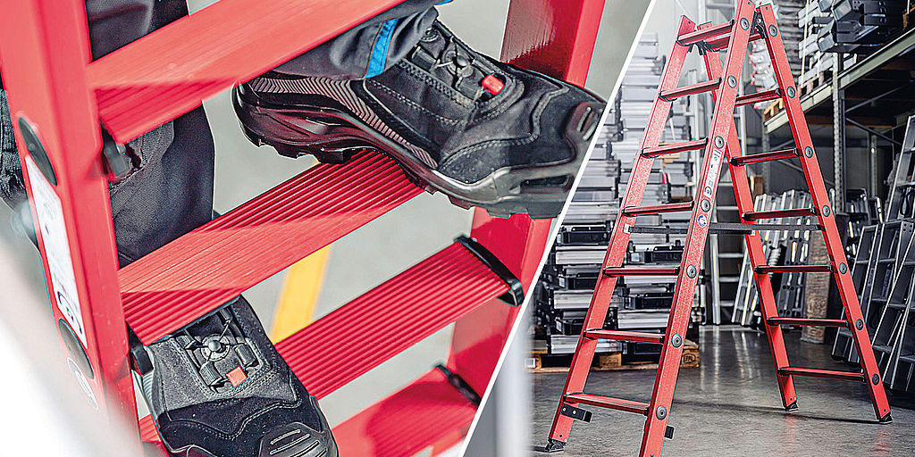 Für maximale Sicherheit besteht bei den Stufenleitern neben dem Leiterkorpus auch ein Großteil der Bauteile aus isolierendem Material, um die Gefährdung durch Körperdurchströmung oder die Auslösung eines Lichtbogens durch Kurzschluss oder Erdschluss zu verhindern. So gelinge es, das verbleibende Risiko so gering wie möglich zu halten. Für einen sicheren Stand von Leiter und Anwender sorgen die 80 mm tiefen Stufen, konisch geführte Holme und der patentierte nivello-Leiterschuh, der über eine 2-Achsen-Neigungstechnik sowie eine praktische Anstellwinkel-Kontrolle verfügt. Zusätzliche Stabilität bietet zudem die Stufen-Holmverbindung.