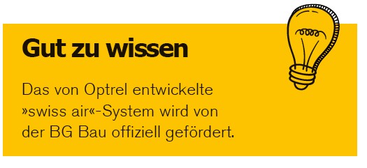 In Handwerksbetrieben und auf der Baustelle sind Schadstoffe wie Holzstaub, Asbeststaub und Quarzfeinstaub immer in der Luft. Gesundheitsschädlich sind vor allem die Feinstäube, welche beim Einatmen weder sichtbar sind noch wieder herausgehustet werden können. Die feinen Partikel gelangen wegen ihrer geringen Größe sehr leicht in die Lunge, wo sie typische Erkrankungen wie Husten, Atemnot, chronische Bronchitis, Lungenfibrose, Quarzstaublunge sowie diverse Krebsarten auslösen können. Davor muss jeder Unternehmer seine Mitarbeiter bestmöglich schützen. Stationäre Absaug- und Belüftungssysteme, welche zur Reduktion der in der Luft konzentrierten Schadstoffe dienen, kommen hier jedoch häufig an ihre Grenzen oder reichen nicht mehr aus. Ein ortsunabhängiger und effizienter Schutz ist für die maximale Arbeitssicherheit folglich unerlässlich. Doch herkömmliche Atemschutzmasken sind meist mit Atemwiderstand, Müdigkeit und Schwitzen verbunden. Das »swiss air«-Gebläse, das sowohl nach TH3 als auch nach TM3 zertifiziert ist, soll hier Abhilfe schaffen.