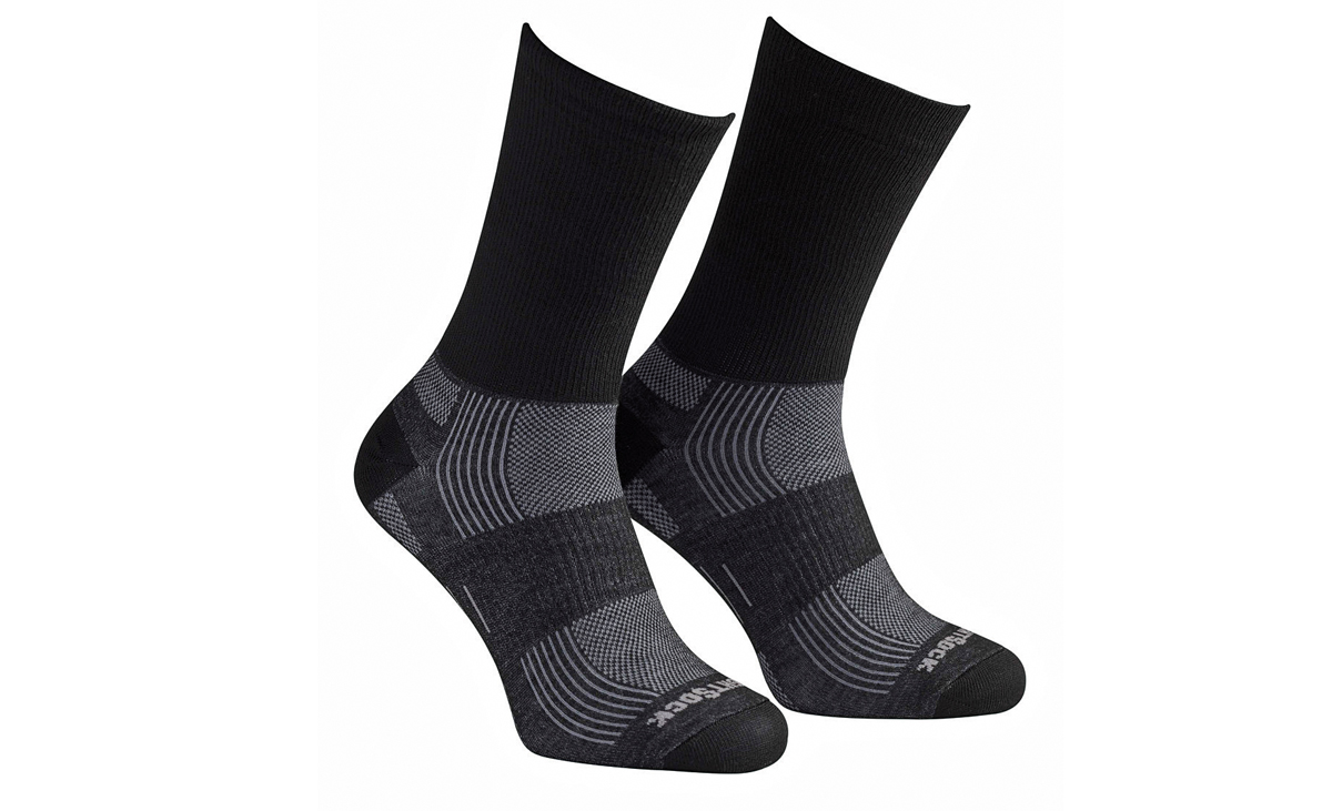 Schuhe mit eingearbeiteten Stahlkappen, aus schnittfesten Materialien bzw. mit durchtrittsicherer Sohle sind nicht so flexibel wie der Alltagssneaker. Gerade deshalb sollte ein besonderes Augenmerk auf die Socke gelegt werden. Der US-amerikanische Hersteller Wrightsock hat vor Jahren das Prinzip der doppellagigen Socke erfunden und patentieren lassen. Das Prinzip der Socken von Wrightsock beruht darauf, dass diese aus zwei miteinander verbundenen, eigenständigen Socken bestehen – einer Polyester-Innensocke und einer gestrickten Außensocke. So wird die Reibung, die eigentlich zwischen »Normalsocke« und Oberhaut des Fußes stattfindet, in die beiden Sockenlagen verlagert, wodurch Blasen können verhindert werden können.