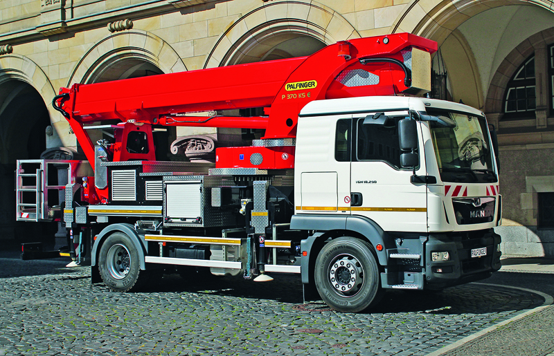 Mit der »P 130 A« will das Unternehmen seine Smart-Klasse auf den Pick-up bringen – mit einer maximalen Arbeitshöhe von 13 m, einer maximalen seitlichen Reichweite von 6,3 m und einem Gesamtgewicht von 3,2 t. Mit der »P 200 Axe« entwickelte Palfinger ebenso eine besonders kompakte Bauweise für Hubarbeitsbühnen der Smart-Klasse und will sie mit 3,5 t Gesamtgewicht und 5,39 m Länge bei der Transportstellung zum bevorzugten Gerät für beengte Einsatzgebiete machen. Dass Hubarbeitsbühnen auch auf Raupenträgerfahrzeugen einsetzbar sind, demonstrierte Palfinger vor drei Jahren mit der »P 150 AJTK«. Jetzt folgt mit der »P 250 AJTK« die größte Bühne der Tracked-Klasse, die für Arbeitshöhen bis 25 m ausgelegt ist. x