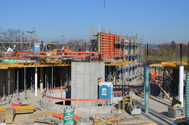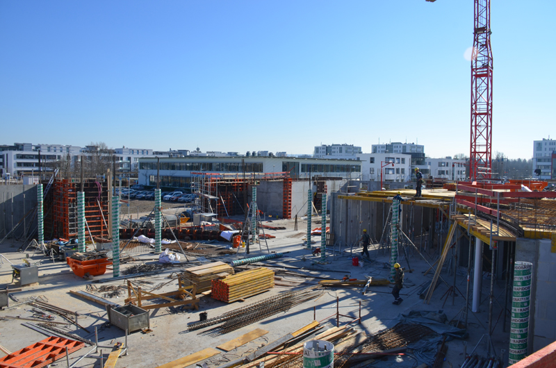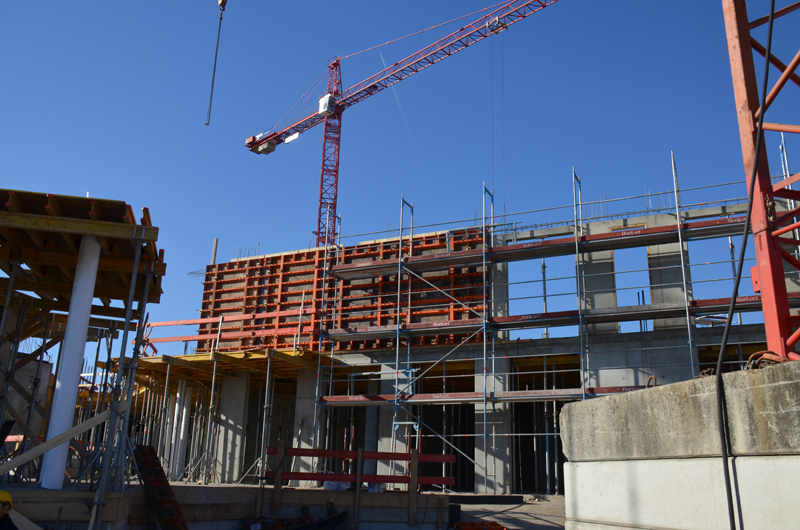 Alle Betonkonstruktionen werden mit Schal- und Rüstsystemen von Paschal geformt. Für die Absturzsicherung an den Deckenrändern sorgt das neue Seitenschutzsystem »Secuset« von Paschal. Um die vorgegebene Architektur, außen wie innen, maß- und formengenau umzusetzen, setzt die Bauunternehmung außerdem auf Schal- und Rüstsysteme des Herstellers.