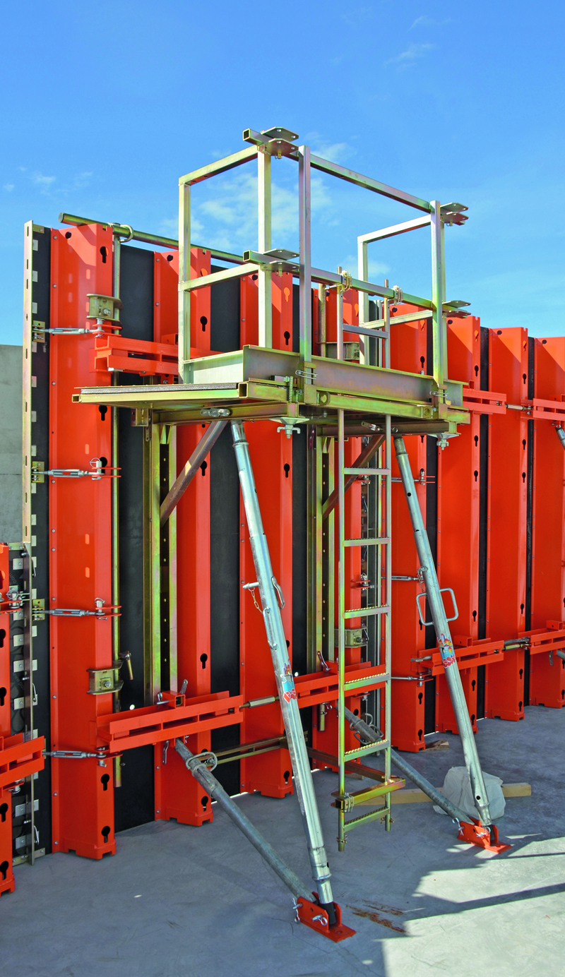 Als praktisch und sicher präsentiert sich die verstellbare Stützenschalung »Grip«, die als komplette Systemeinheit inklusive Richtstreben, Arbeitsplattform und fest verbundener Leiter zur Arbeitsebene auf die Baustelle geliefert wird. Zum Transport wird die »Grip«-Schalung platzsparend zusammengeklappt. Der Klappmechanismus erleichtert zudem das Umsetzen der Stützenschalung mit nur einem Kranhub.