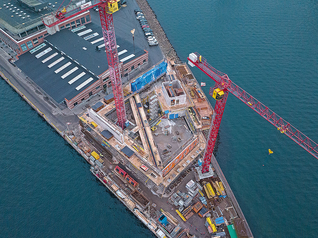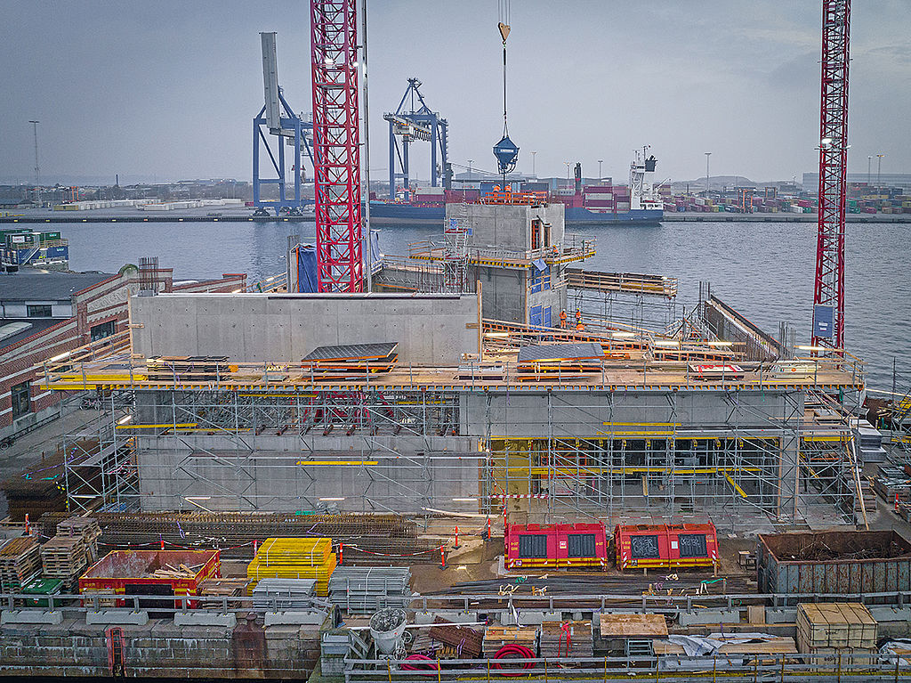Zum Schalen von Trägern, Wandkonstruktionen, dem Aufzugsschacht und den Treppenkonstruktionen innen und außen nutzte der Paschal-Kunde etwa 800 m² des Wandschalungssystems »Logo.3« sowie 12 Klettersysteme 240 cm und etwa 200 t Rüst-, Ergänzungs- und Verbindungsmaterialien. So konnten die schaltechnisch anspruchsvollen Aufgaben wie geplant zügig umgesetzt werden. Die Gebäudekonstruktion wird von tragenden Ortbeton-Megaträgern dominiert. Die Träger sind in Sandwichbauweise mit tragender Rückwand, Dämmung und einer dünnen Rückwand und Frontfläche in Sichtbetonoptik gefertigt. Die Schal- und Rüstplanung wurde von Paschal-Danmark in Abstimmung mit LM Byg ausgeführt.