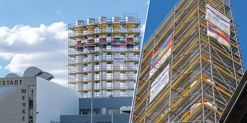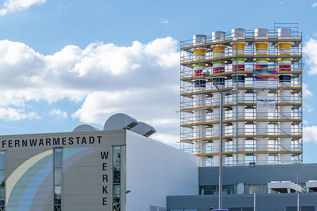 Das Fernwärmeleitungsnetz der ehemaligen Thüringer Residenzstadt erstreckt sich heute auf über 40 km. Allein das 1994 in Betrieb genommene Blockheizkraftwerk versorgt etwa 9 000 Haushalte mit umweltschonender Fernwärme und Strom. Die fünf Schornsteine des Kraftwerks ragen mit rund 30 m wie eine Landmarke in die Höhe. Vor kurzem mussten diese neu beschichtet werden. Hierzu montierte das regional ansässige Gerüstbauunternehmen B&E aus Bad Langensalza ein Arbeits- und Schutzgerüst auf Basis des flexiblen »Peri Up« Gerüstbaukastens.