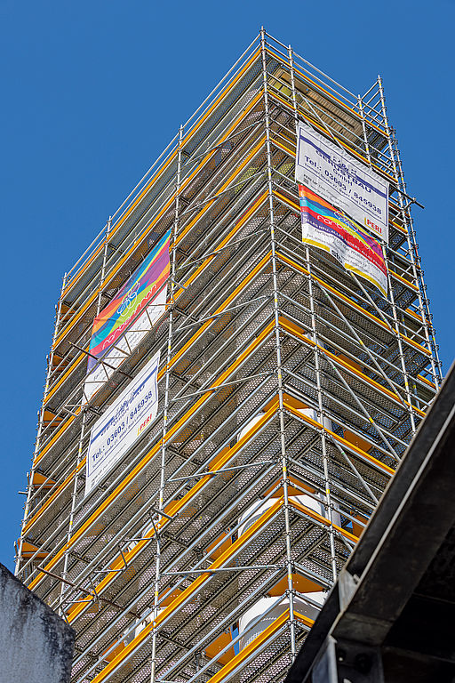 Zusätzlich zur schnellen Gerüstmontage ist auch die nahezu ausnahmslose Verwendung von standardisierten Systembauteilen Grundlage für eine sichere Gerüstnutzung, so Peri. So ergänzten System-Eckbleche die mit Gerüstbelägen ausgestatteten Arbeitsebenen und passten diese eng an die Schornsteinrundungen an. Der große Vorteil dabei: Ohne Stolperkanten und Lücken und mit geringstmöglichen Abständen zum Bauwerk konnte später nicht nur sicherer, sondern dadurch auch schneller und mit hoher Ausführungsqualität gearbeitet werden.