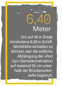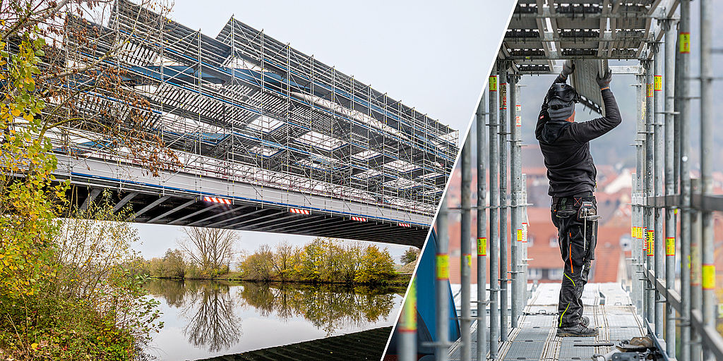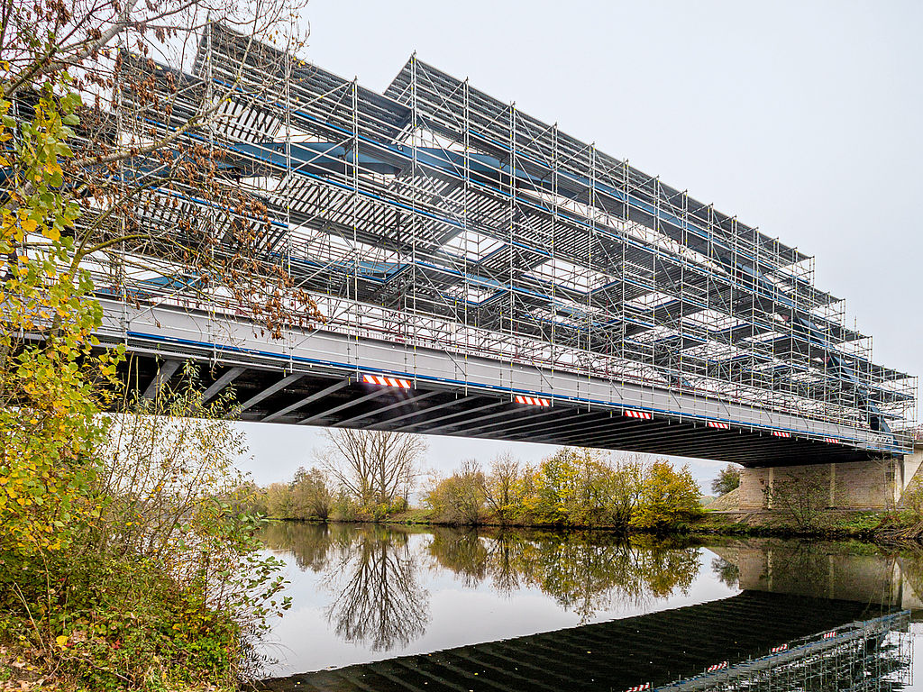 Die Ost- und Westseite wurden dabei nacheinander eingerüstet und saniert. Das ermöglichte in Verbindung mit einer Ampelregelung eine einspurige Fahrbahnnutzung sowie die Geh- und Radwegnutzung während der gesamten Sanierungsmaßnahme. Auch der Schifffahrtsbetrieb auf dem Main zwischen Schweinfurt und Bamberg durfte nicht beeinträchtigt werden. Um auf 40 m Breite mindestens 6,40 m Schifffahrtshöhe einhalten zu können, war die seitliche Abhängung der »Peri Up«–Gerüstkonstruktion auf maximal 35 cm unterhalb der Brückenunterseite begrenzt.