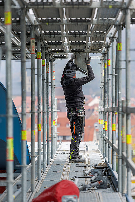 Gerüstbau Eckert & Schwarz mietete das »Peri Up«–Arbeitsgerüst auf Grundlage von Flex Stielen und Horizontalriegeln projektbezogen an – mit der Option, die Bauteile nach Mietende käuflich zu übernehmen. Zudem erlaubte das metrische »Peri Up«-Systemraster, dass die in der Flex Bauweise üblichen 25-cm-Belagbreiten mit den 33-cm-Stahlbelägen seines Fassadengerüsts auf Basis des »Easy«-Stiels kombiniert werden konnten. Beide Belagvarianten sind aufgrund der Belagsicherung sofort nach dem Einlegen gegen Abheben gesichert.
