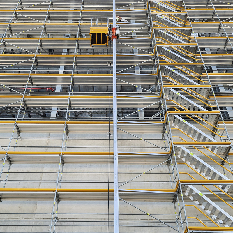 Darüber hinaus legen Peri und Alimak beide großen Wert auf ergonomische Abläufe und Arbeitssicherheit: Sowohl beim Montieren des »STS 300« als auch beim Entladen der Gerüstbauteile auf dem Gerüst stehen die Monteure aufrecht und in einer gesicherten Position. Das liegt daran, dass die Transportkörbe einfach zum Geländer geschwenkt werden und damit problemlos in Greifweite liegen. Die Gerüstbauer können beim Arbeiten am Korb also geschützt hinter den Geländern bleiben, ohne für die Zugänglichkeit zum Korb Geländer aushängen zu müssen.