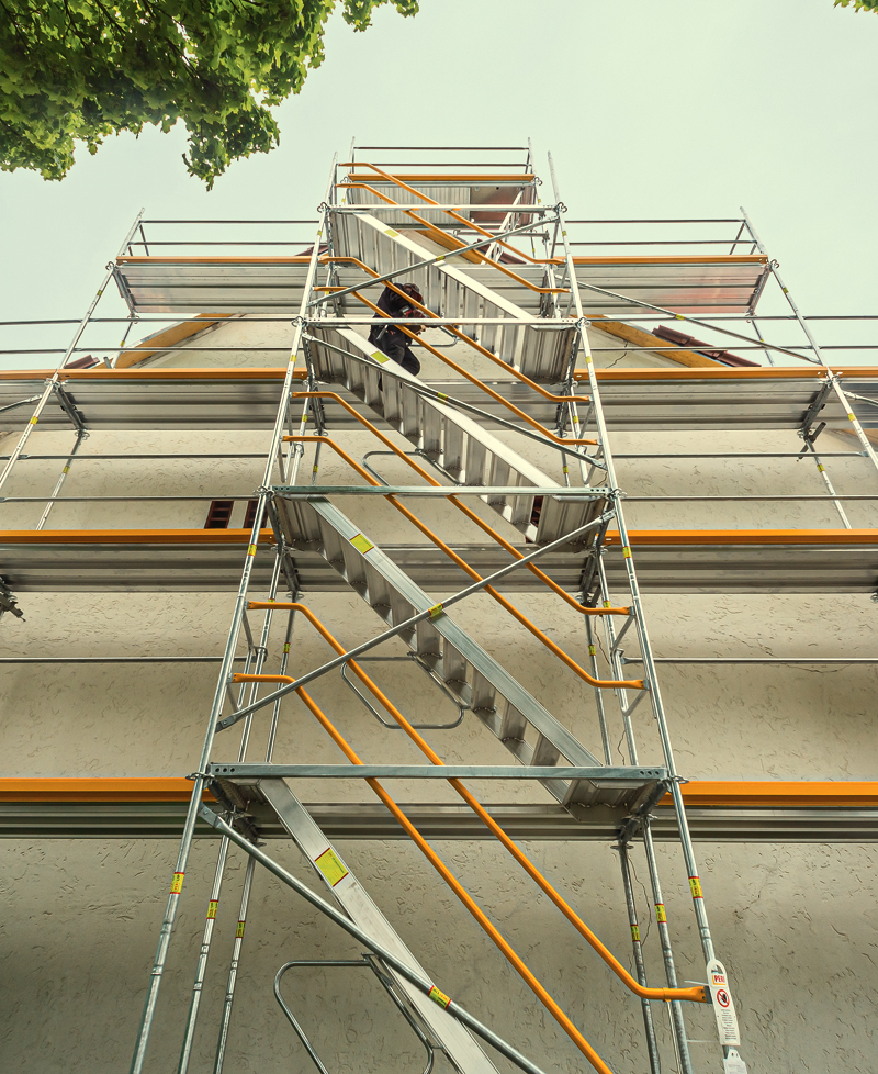 Für das Fassadengerüst »Peri Up Easy« sind auch Durchstiegsbeläge und Leitergangtafeln mit 67 cm Breite verfügbar. Die neue Gerüsttreppe »EAS 67« zeichnet sich Herstellerangaben zufolge ebenfalls durch eine hohe technische Sicherheit über die systembedingte vorlaufende Geländermontage und die integrierte Abhebesicherung aus. Die Geländer sind längs- und stirnseitig vorlaufend montierbar und werden ohne Kupplungen montiert. Aufgrund verschiedener Größen sind die Gerüsttreppen flexibel einsetzbar. Rutschfeste Treppenstufen steigern die sichere Nutzung. Das geringe Gewicht der Treppenelemente erlaubt laut Peri ein gutes Handling für körperschonendes Arbeiten. Die als förderwürdig anerkannten Bautreppen sind gradläufig (ein- oder mehrläufig) oder gewendelt aus wiederverwendbaren Systembauteilen mit Seitenschutz und entsprechen der BGR 113/DGUV Regel 101-002. Hierzu gehört insbesondere die sichere Begehbarkeit der Bautreppen. J