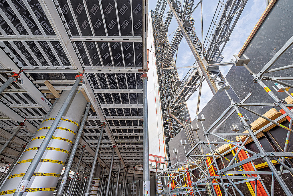 Innerhalb des unteren Stahlrings und teils hinter dem »Peri Up«-Arbeits- und Schutzgerüst errichtete man parallel den Neubau, der Stockwerk für Stockwerk in die Höhe wuchs. Mit dem Wandschalungssystem »Maximo« und der Deckenschalung »Skydeck« ließen sich auch die zahlreichen Sichtbetonflächen an Wänden und Decken schnell und professionell realisieren, so Peri. Um den Mehrbedarf an Schalungselementen abzudecken, nutzte das Bauunternehmen die Möglichkeit, Kauf- und Mietelemente von Peri miteinander zu kombinieren. Im Schutz der umgebenden »RCS«-Kletterschutzwand konnte so in jeder Höhe am Rohbau witterungsgeschützt und sicher gearbeitet werden. Dabei halfen die einseitige Ankertechnik der »Maximo«-Wandschalung und das leicht zu handhabende »Skydeck«-Deckenschalungssystem nach Angaben von Peri im Zeitplan zu bleiben.
