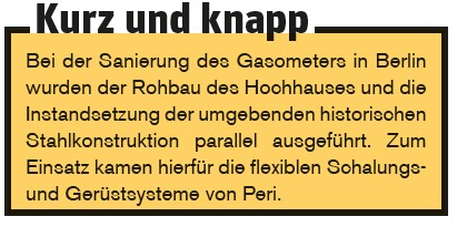 Wie bereits andere Gebäude auf dem Euref-Campus realisiert den Umbau des Gasometers das Bauunternehmen Wolff & Müller. Als Teil des eingespielten Teams wurden auch hier die Ingenieure der Peri Niederlassung Berlin einbezogen, die sich um die Herausforderungen rund um Schalung und Gerüst kümmerten. Denn der Rohbau des Hochhauses und die Instandsetzung der umgebenden historischen Stahlkonstruktion sollten parallel ausgeführt werden. Auf engstem Raum und weitestgehend ohne Beeinträchtigung des Umfelds.