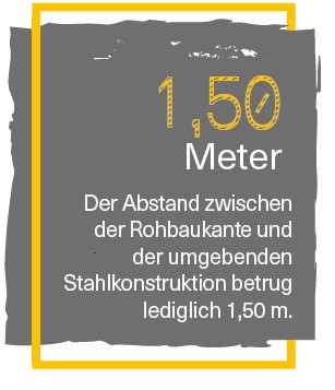 Nach einer kurzen Planungszeit von rund drei Monaten begannen im August 2021 die Rohbauarbeiten. Gleichzeitig startete das Bauteam die Sanierung des historischen Stahlgerüsts. Dabei betrug der Abstand zwischen der Rohbaukante und der umgebenden Stahlkonstruktion lediglich 1,50 m. Daher setzten die Experten auf den »Peri Up«-Gerüstbaukasten, mit dem sie eine Gerüstlösung konstruierten, die über die gesamte Höhe eng an die Form der runden Stahlkonstruktion angelegt wurde. Zum Schutz der Umgebung innen und außen vollständig eingehaust, wanderte das Gerüst während der Sanierungsphase im Uhrzeigersinn abschnittsweise rund um den Gasometer. So konnte Stahlsegment um Stahlsegment mithilfe der Sandstrahltechnik entschichtet und mit einem neuen Korrosionsschutz versehen werden, während gleichzeitig die Rohbauarbeiten stattfanden. Mit dieser Vorgehensweise wurde auch das Umfeld bis zum Abschluss der Sanierung weitestgehend vor übermäßigem Baulärm und Schmutz geschützt.