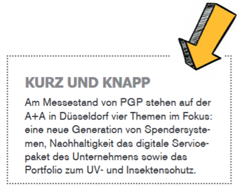 Am Messestand von PGP stehen vier Themen im Mittelpunkt: eine neue Generation von Spendersystemen für eine optimale und hygienische Dosierung von Hautschutzmitteln; das Engagement von PGP in Sachen Nachhaltigkeit sowie die in diesem Zusammenhang zertifizierten Produkte; das digitale Servicepaket der Euskirchener; sowie ihre Mittel zum UV- und zum Insektenschutz, die durch die Auswirkungen des Klimawandels künftig noch mehr in den Fokus rücken werden.