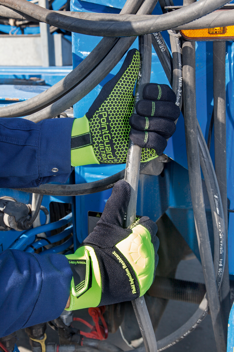 Gerade bei Hydraulikleitungen ist ein erhöhter Handschutz notwendig, um gefährliche Verletzungen zu vermeiden. Der »Fluid Power«-Schutzhandschuh schützt unter anderem vor Schnitt- und Stichverletzungen: Die speziellen Drahtgeflechte und Spiraldrahteinlagen verursachen meist weniger dramatische Verletzungen, wie Kratz-, Schnitt- und Stichverletzungen, und kommen im Arbeitsalltag verhältnismäßig häufig vor. Wesentlich gefährlicher im Verletzungsverlauf sind jedoch Verletzungen durch Öl- oder Fluideinspritzungen, die durch sogenannte Nadel- oder Haarrisse an Hydraulikschläuchen verursacht werden; meist tritt hier ein feiner Ölstrahl mit Hochdruck aus. Verletzungen dieser Art kommen relativ selten vor, sind aber hochgradig gefährlich und führen in der Praxis häufig zu Amputationen der betroffenen Extremitäten oder im schlimmsten Fall sogar zum Tod. Bislang gab es laut Pirtek noch keine Schutzkleidung, die vor solchen Fluideinspritzungen schützte.