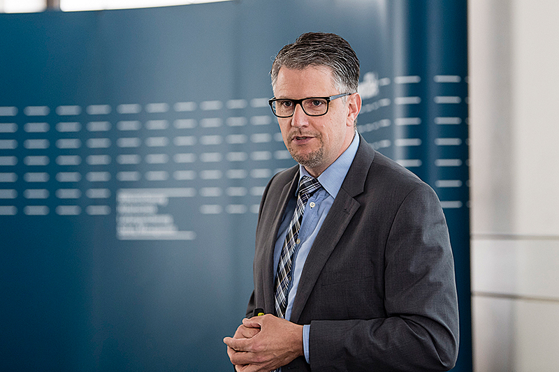 Thomas Riegler, Fachkraft für Arbeitssicherheit in der Dillinger Hütte, berichtete aus der Praxis. Auch er widmete sich dem Gesamtkonzept Rettung und unterstrich, dass es längst nicht ausreiche, den Mitarbeitern Schutzausrüstungen auszuhändigen. »Unser Konzept setzt nicht bei dem an, was der Mitarbeiter machen soll. Vielmehr muss das Unternehmen vorarbeiten, indem es Stürze verhindert und einen Plan für die Maßnahmen im Falle eines Absturzes festlegt.« Zur unternehmerischen Verantwortung gehöre es selbstverständlich, die individuelle Kompetenz der Helfer regelmäßig zu schulen. Das Saarbrücker Unternehmen kann elf Höhenretter vorweisen, drei von ihnen durchlaufen derzeit eine Qualifikation zum Ausbilder. Montage- und Wartungsarbeiten in 10 m oder 20 m Höhe gehören bei Europas führendem Grobblechproduzenten zur Tagesordnung. Deshalb sieht das Dillinger-Konzept vor, dass immer drei Spezialisten im Werk und somit unverzüglich zur Stelle sind.